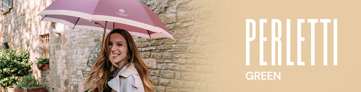 All umbrellas from the Perletti Green line are made with handles and details in untreated wood and R-PET certified fabrics, which attests of the transformation process from plastic to fabric: the bottles are cleaned, reduced to filaments, then pressed and melted, until becoming high quality spun fibers.