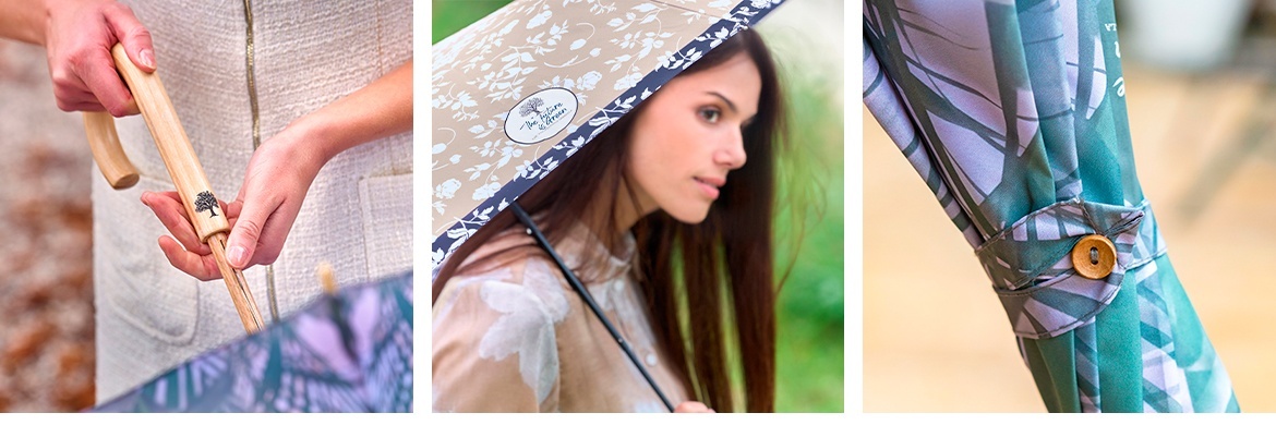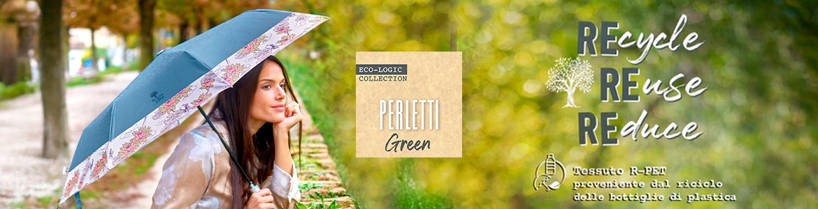 Tutti gli ombrelli della linea Perletti Green sono realizzati con impugnature e dettagli in legno non trattato e tessuti certificati R-PET, che attesta il procedimento di trasformazione da plastica a tessuto: le bottiglie vengono pulite, ridotte in trucioli, poi pressati e fusi, fino ad ottenere fibre filate di alta qualità.